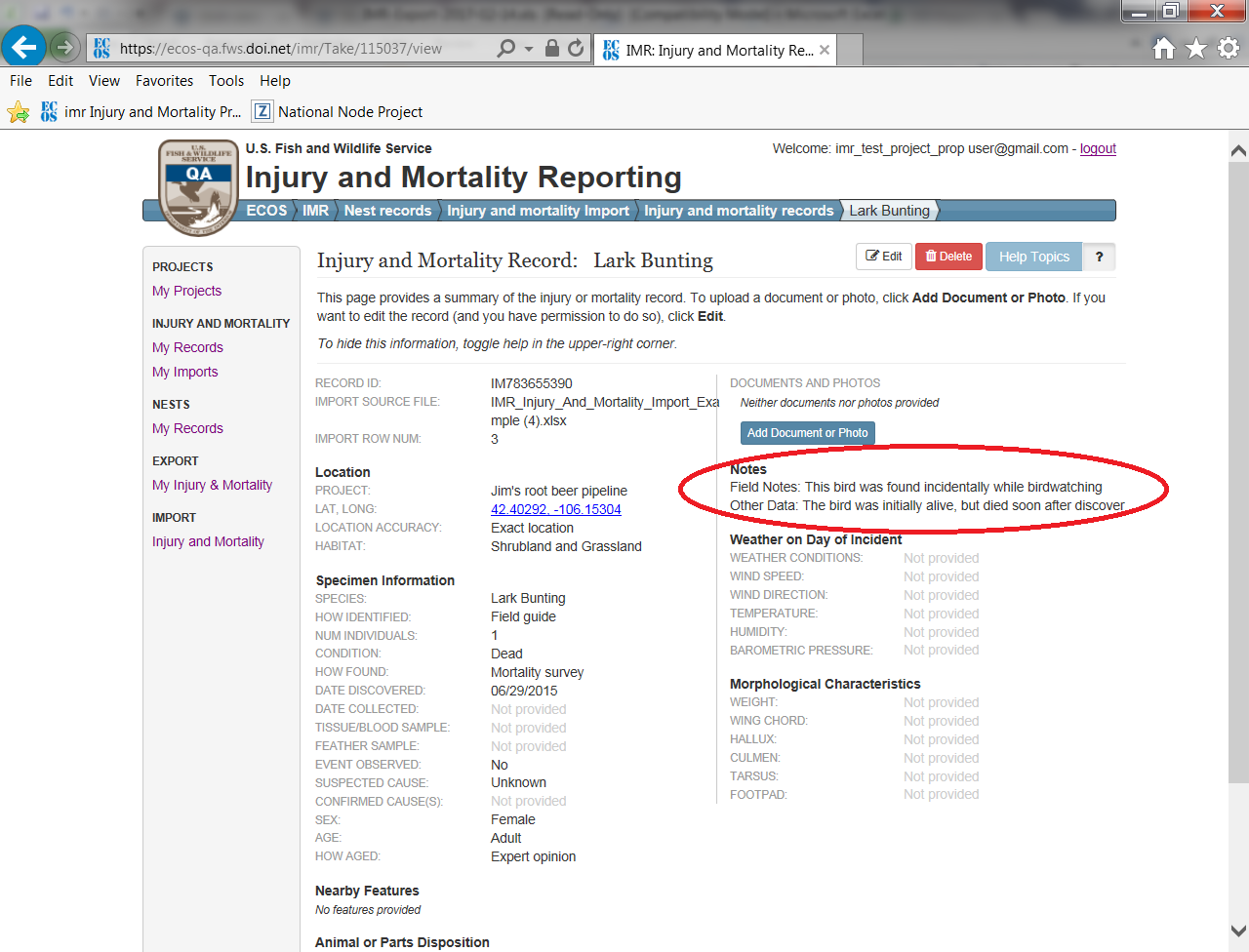 Users must create a Project record before they will be able to save injury/mortality records or nest records.