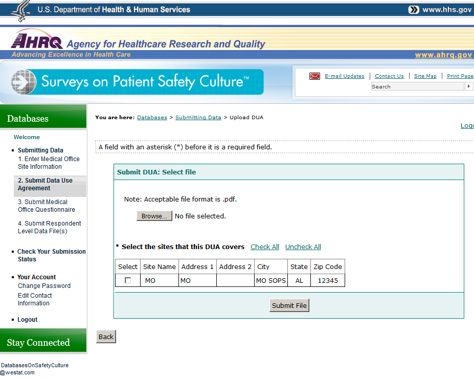 Attachment G: Example Screen Shots of Medical Office Survey on Patient Safety Culture Data Submission Web Site Information Collection
