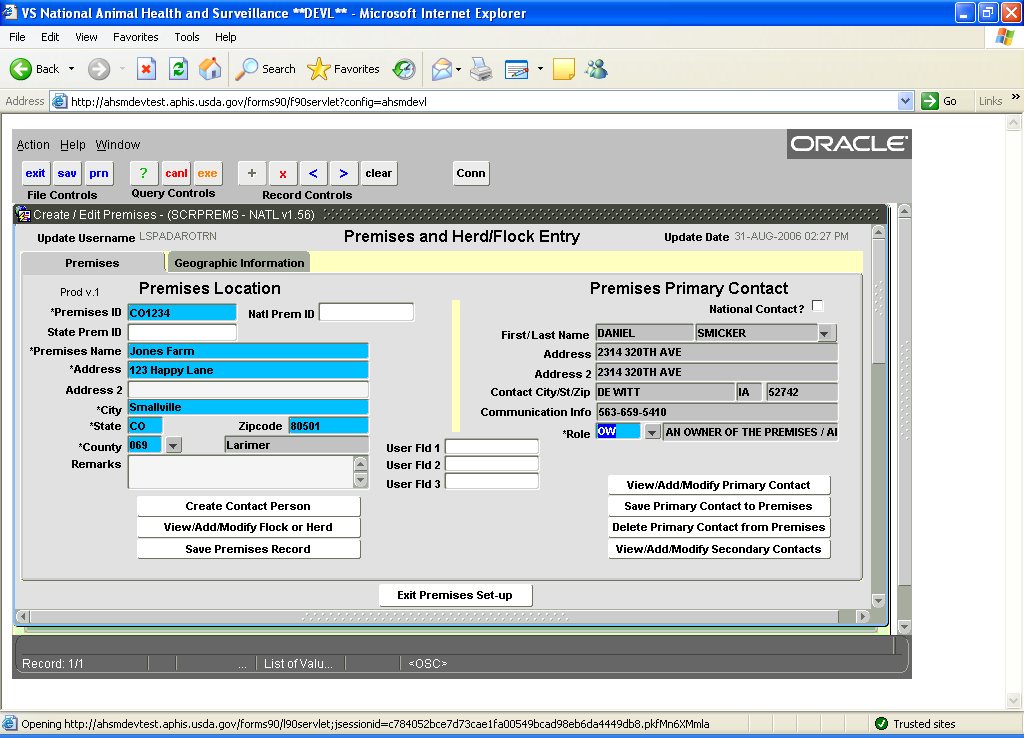 1. Primary Contact for Premises--Information typically obtained from VS Forms 5-19A-D and 5-22, but may be entered from other forms that include owner or contact information, or through phone, e-mail, fax, or other communications not using a form.