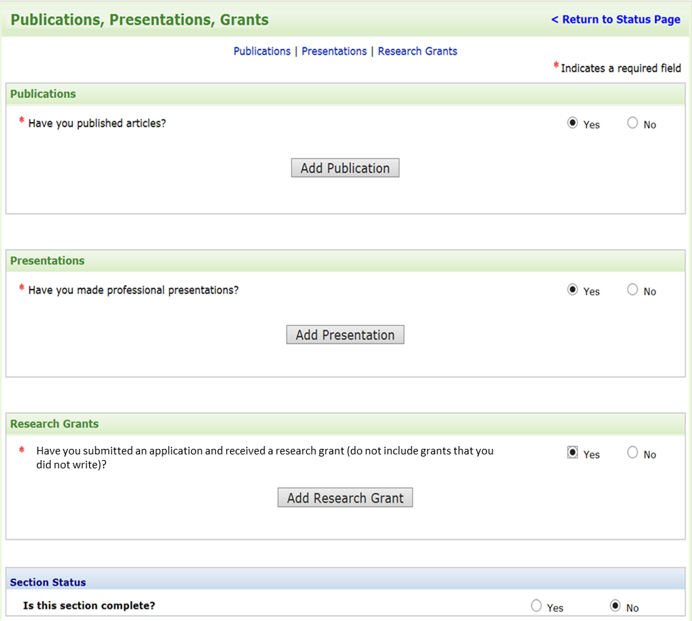 Publications, Presentations, Grants, Honors, and Awards Screenshot