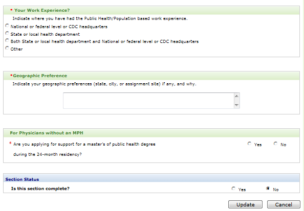 The main screenshots of the Application pages, sections, or subsections are from EIS with additional screenshots of additional data elements collected by other CDC fellowships.
