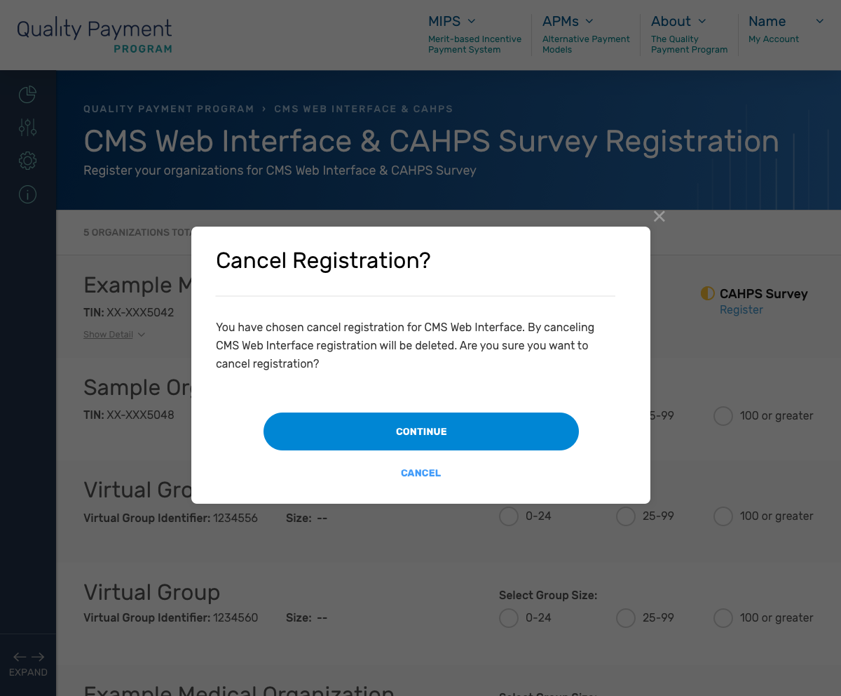 If your group is registered to participate in MIPS utilizing the CMS Web Interface and/or administering the CAHPS for MIPS survey for the 2017 performance period, but wishes to cancel the registration, you can log into the registration system and cancel the registration any time before the registration period closes on June 30, 2018 at 11:59 pm EDT. You will not be allowed to cancel the group’s 2018 registration after this date. If you want to re-register the group to participate in MIPS utilizing the CMS Web Interface and/or administering the CAHPS for MIPS survey after cancelling your registration, please refer to Section IV (Submit a New Registration) of this guide.