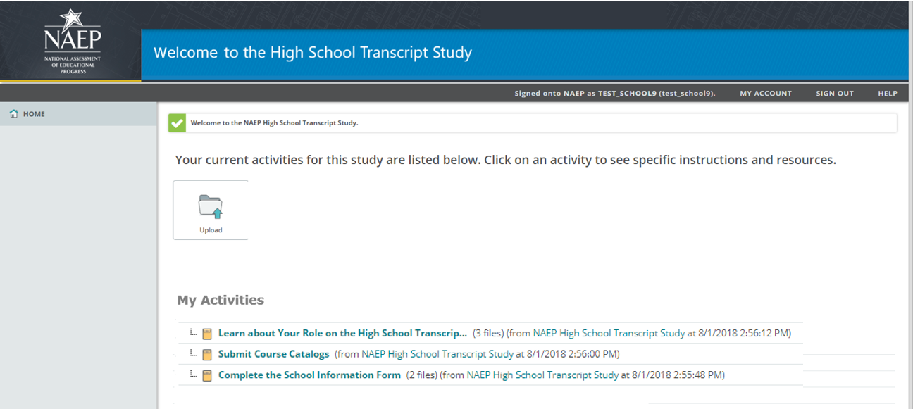 Because the list of activities that appears on the Home page is dynamic and depends on which tasks the school is designated to complete, as well as when the site is accessed, the screen shot below is example of how the Home page looks under the following conditions: