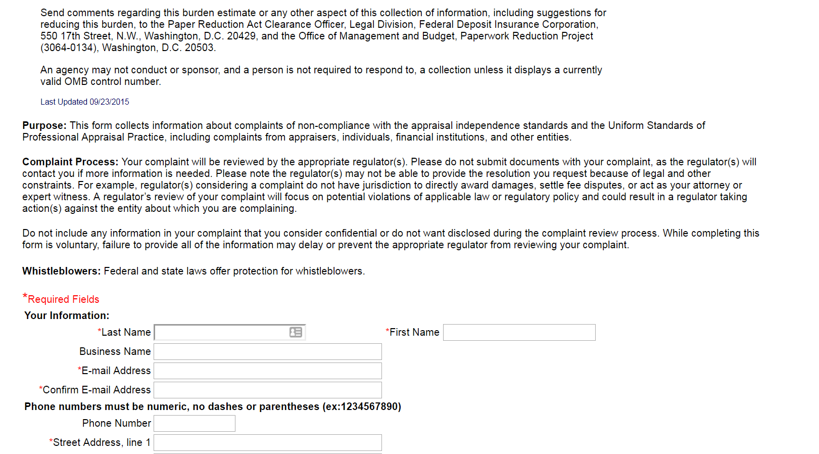 Form FDIC 3064-0190 FDIC 3064-0190 Interagency Appraisal Complaint Form