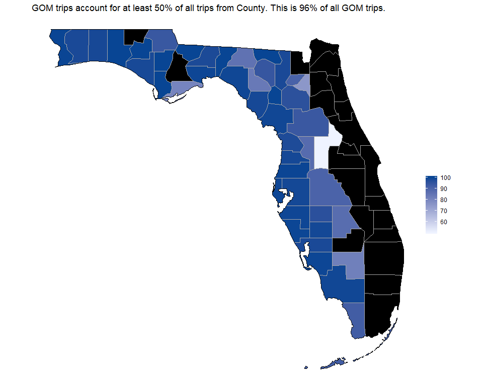 Table 2 also shows the share of trips originating from each county that went to the GOM and the share that went to the GOM to fish for (targeting or catching) gag grouper. The table is sorted in descending order by the share that went to the GOM. We plan to sample from the counties with at least 50% of trips to the GOM: Calhoun to Lake. These 45 counties account for 96% of all GOM trips and 99% of all gag grouper trips in the GOM. The map in Figure 1 shows the percentage of trips to the GOM from counties that will be sampled for the survey. Overall, 13% of trips in these counties are associated gag grouper. This suggests that every 8th angler from these counties is associated with gag grouper. Consequently, we would need around 8 times as much sample to reach gag grouper anglers, even from these counties. The pilot study (see Part B, section 22) found, however, that every 3th angler. If we use these results, then we would only need around around 3 times as much sample to reach gag grouper anglers. The pilot study included one county with a relatively high number of trips associated with gag grouper and another county with a relatively low number of trips associated with gag grouper. Therefore, we think that the gag grouper trip prevalence rate of 32% from the pilot study is an appropriate estimate for gag grouper trip prevalence for the rest of the coastal counties.