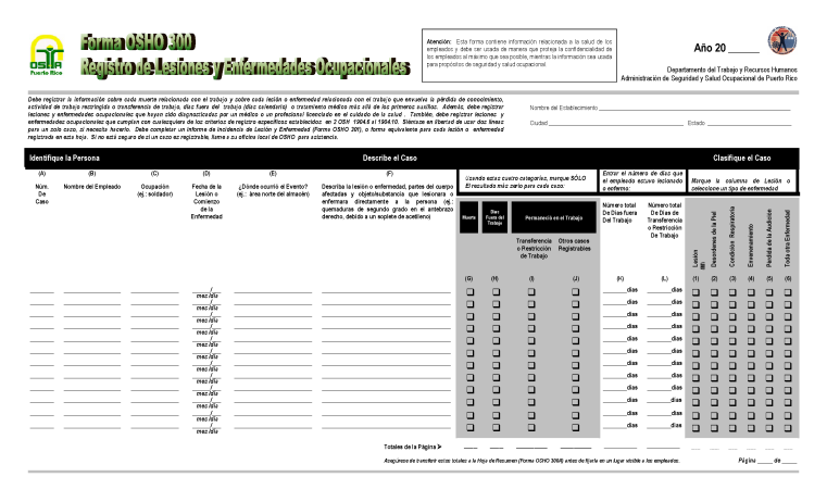Paso 3: Refiérase a las Formas OSHA utilizadas para Registrar Lesiones y Enfermedades Ocupacionales de su establecimiento. Copias de estas formas le fueron enviadas a finales del 2018 :