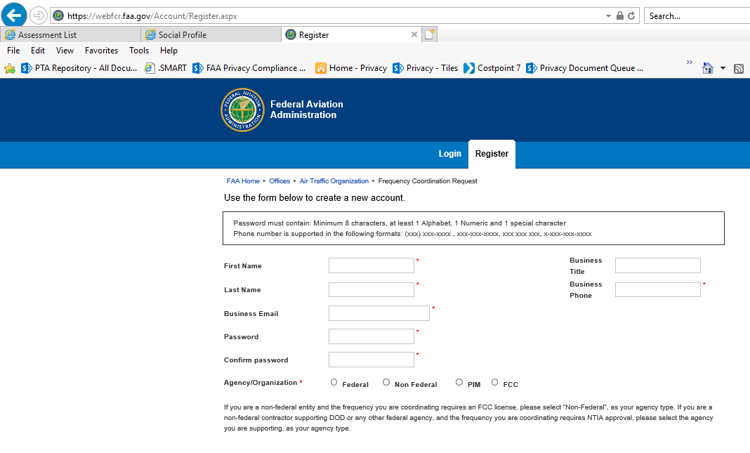 The WebFCR is the Central point of entry for Frequency Coordination Requests (FCRs) from the public thru the FAA Public Internet site at https://webfcr.faa.gov. The user creates and logins to submit a given FCR. The application uses the account data to provide follow-up communications contact information to the processing Spectrum engineers and Frequency Management Officers (FMO), after the technical FCR data is sent to AFM for further action, including engineering and NTIA approval as appropriate.
