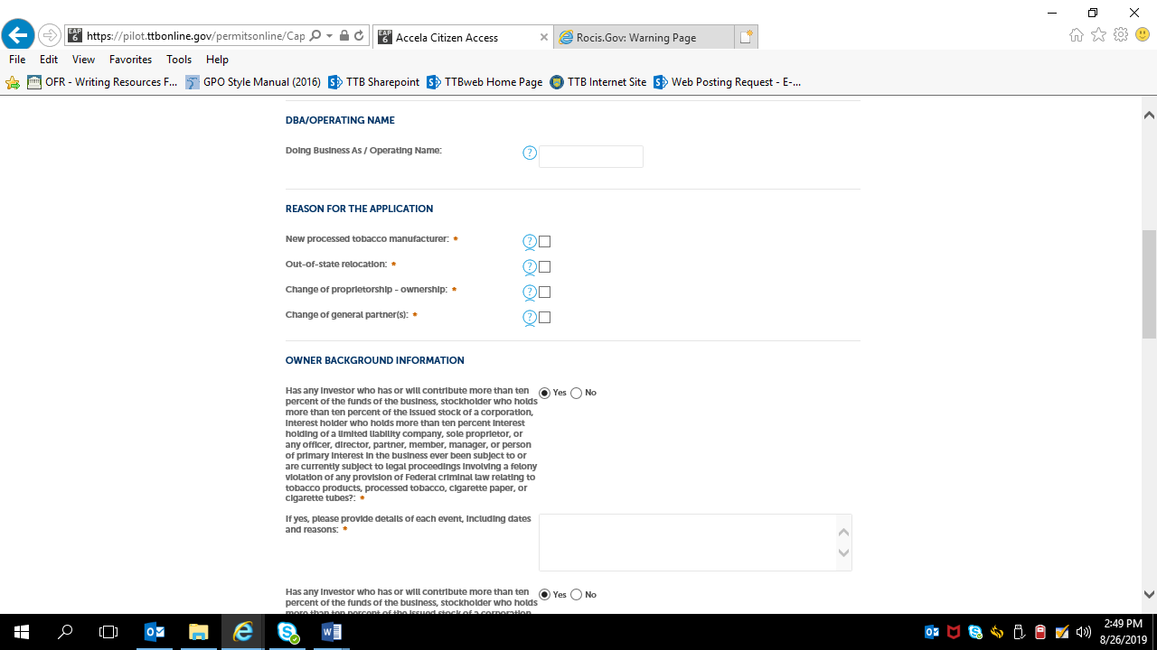 Answering “No” to “Do you currently have another approved or pending permit, registration, or notice with TTB under this EIN?” results in the data fields shown below --