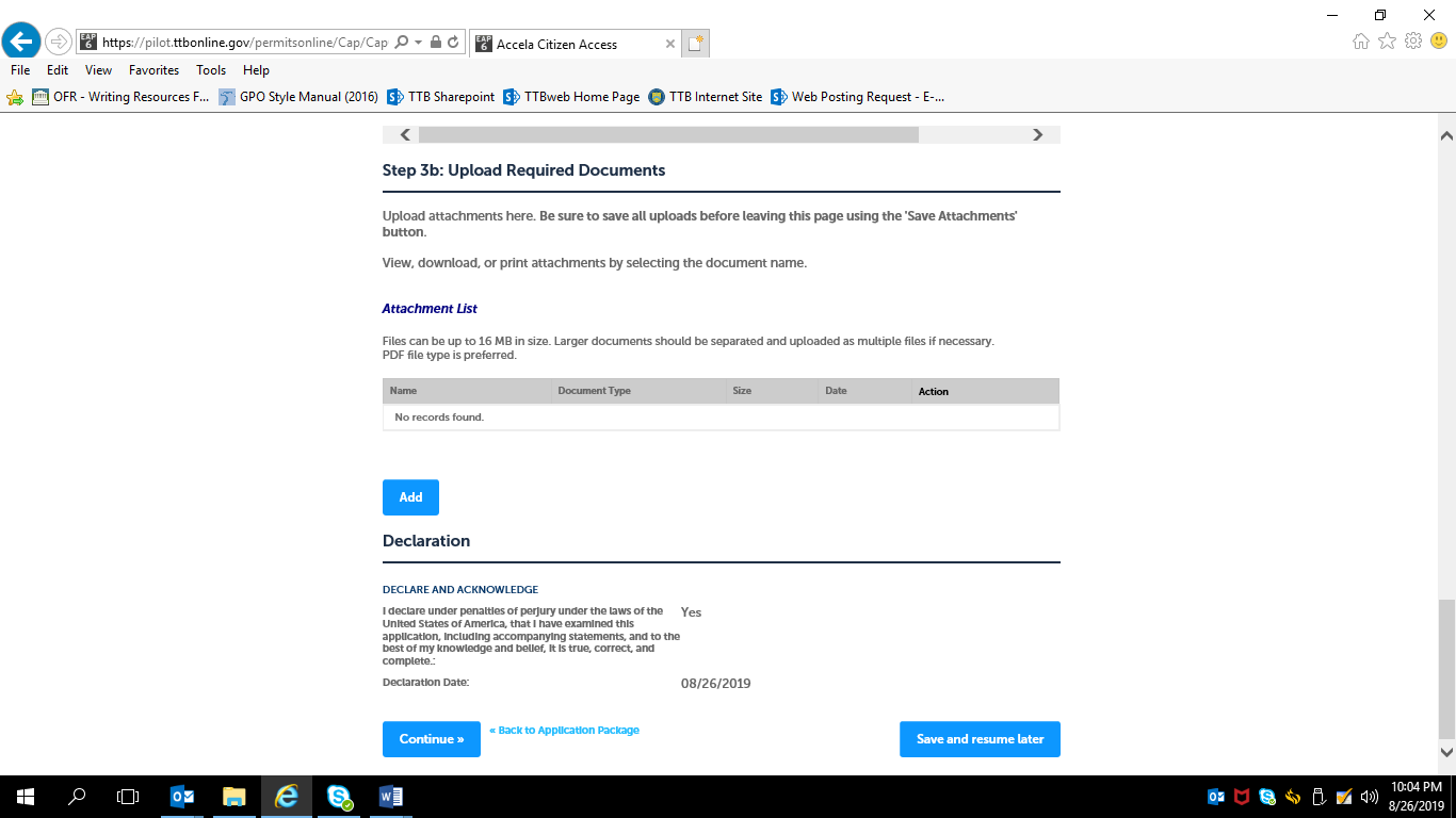 After confirming (or editing and confirming) the provided information, the applicant clicks “Continue,” and is presented with the Application Package screen: