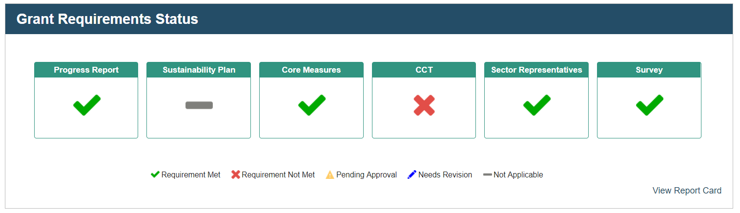 Note: For some requirements, like the sustainability plan, the system makes assumptions. In this case, if a coalition is in Year 3 or Year 7 and did not submit a sustainability plan with their progress report, the Report Card will show a red X. However, if a coalition is not in either of those years, a gray bar will appear under “Status” next to the required year, indicating that this requirement is “not applicable” for the coalition.