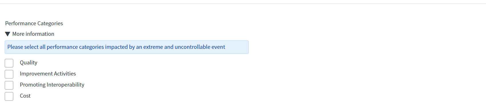 According to the Paperwork Reduction Act of 1995, no persons are required to respond to a collection of information unless it displays a valid OMB control number. The valid OMB control number for this information collection is 0938-1314 (Expiration date: XX/XX/XXXX). The time required to complete this information collection is estimated to average 0.25 hours per response, including the time to review instructions, search existing data resources, gather the data needed, and complete and review the information collection. If you have comments concerning the accuracy of the time estimate(s) or suggestions for improving this form, please write to: CMS, 7500 Security Boulevard, Attn: PRA Reports Clearance Officer, Mail Stop C4-26-05, Baltimore, Maryland 21244-1850. ****CMS Disclosure**** Please do not send applications, claims, payments, medical records or any documents containing sensitive information to the PRA Reports Clearance Office. Please note that any correspondence not pertaining to the information collection burden approved under the associated OMB control number listed on this form will not be reviewed, forwarded, or retained. If you have questions or concerns regarding where to submit your documents, please contact QPP at qpp@cms.hhs.gov.