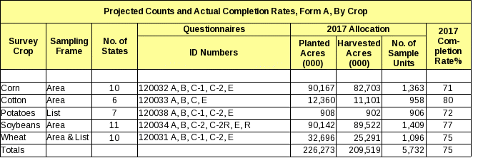 The respondent is only interviewed when the first questionnaire (Form A) is administered; therefore, respondent burden only occurs during this visit. During this interview, the sample field is verified and permission for the enumerator to enter the sample field to set up sample units for collecting plant data is requested. On subsequent farm visits, the enumerator will collect plant data, via Form B, from the sample units. Below are the 2017 completion rates by month and crop.