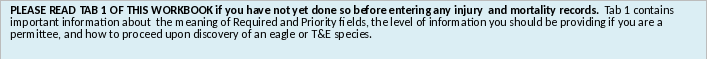 | IMPORTANT NOTE ABOUT REQUIRED AND REQUESTED FIELDS: If you have a permit with the USFWS, your permit conditions may require you to fill in more than just the required and requested fields, or the fields that are required and requested may differ slightly than indicated in this spreadsheet. Please check your permit conditions to make sure you are providing all the information required for compliance with your permit. -DROP DOWN BOXES are provided with several of the fields for your convenience, and to support greater consistency of data for these fields. Please try to use one of the options provided within the drop down boxes for these fields. However, if you can not find the appropriate match in the drop down (or your selection is "Other - describe", you may enter your own text in the field as well. To enter your own text, click on the cell once and start to type your own text. To clear a field, click on the cell once and hit the Delete button. |