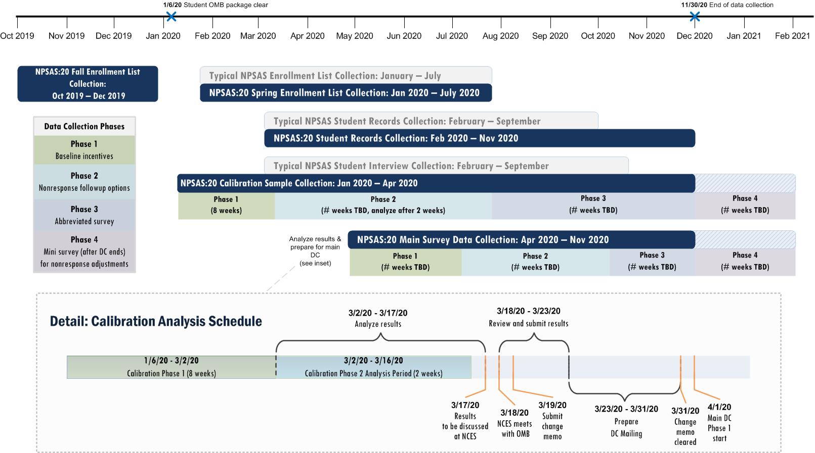 The NPSAS:20 data collection is expected to start early in April 2020 and will involve a 4-phase design—the first two phases will be informed by the experimental incentive manipulation in the calibration sample described above, while the third and fourth phases will be an attempt to obtain any information on the remaining nonrespondents with an abbreviated 15-minute and 5-minute instruments, respectively. Table 11 presents the proposed design.