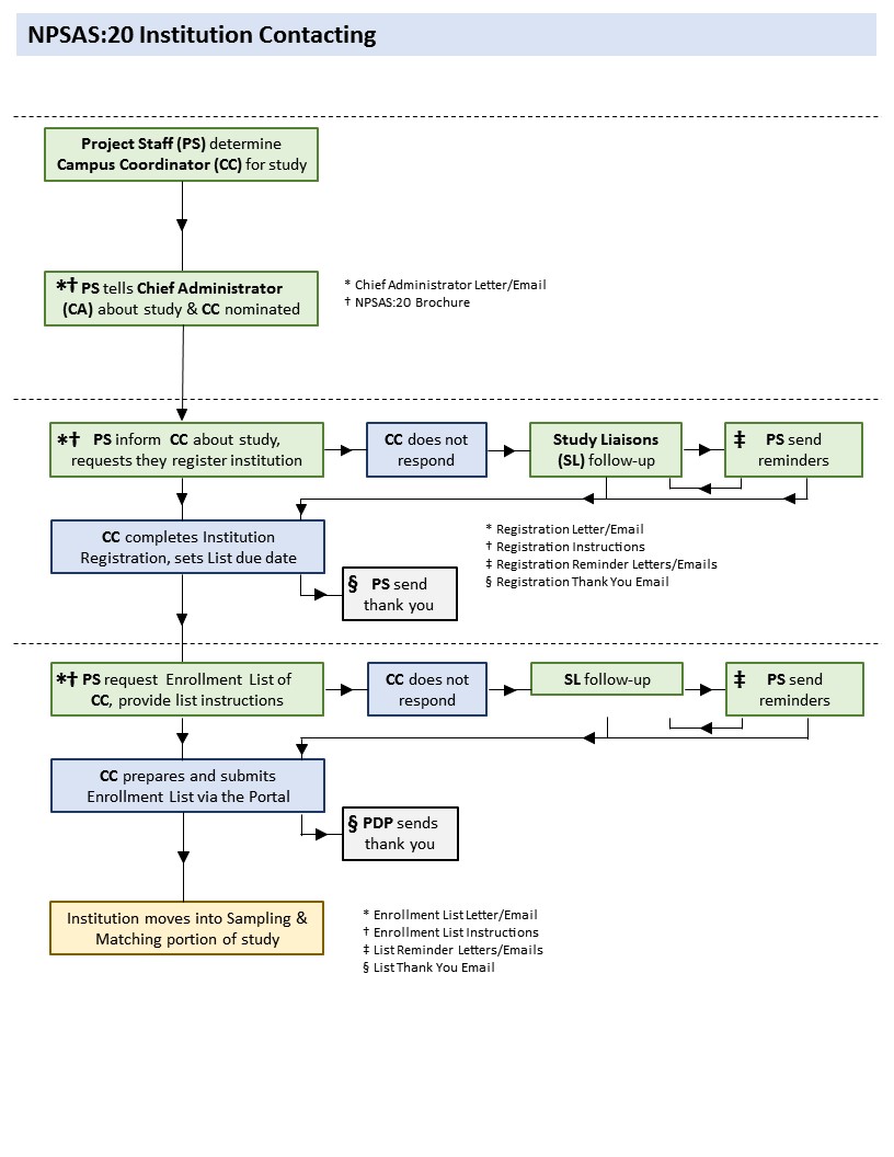 This submission requests clearance for: (1) the 2019–20 National Postsecondary Student Aid Study (NPSAS:20) full-scale student data collection materials and procedures, which includes the institution student record data abstraction and student survey; (2) panel maintenance activities with the field test data sample for the 20/22 Beginning Postsecondary Students Longitudinal Study (BPS:20/22); and (3) carries over respondent burden, procedures, and materials related to the NPSAS:20 institution sampling, enrollment list collection, and matching to administrative data files as approved by OMB in July and September 2019 (OMB#1859-0666 v.23-24). Specific plans are provided below.