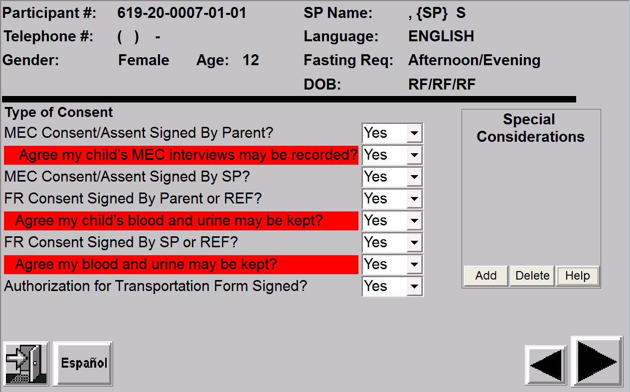 DISPLAY SUMMARY OF RESPONDENT’S SELECTIONS. BECAUSE CONSENT WAS GIVEN ELECTRONICALLY, THE PROGRAM WILL FILL THE DROP-DOWN LISTS.