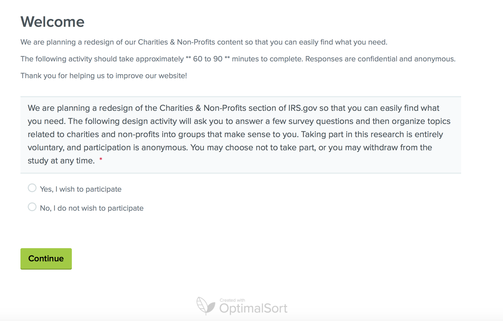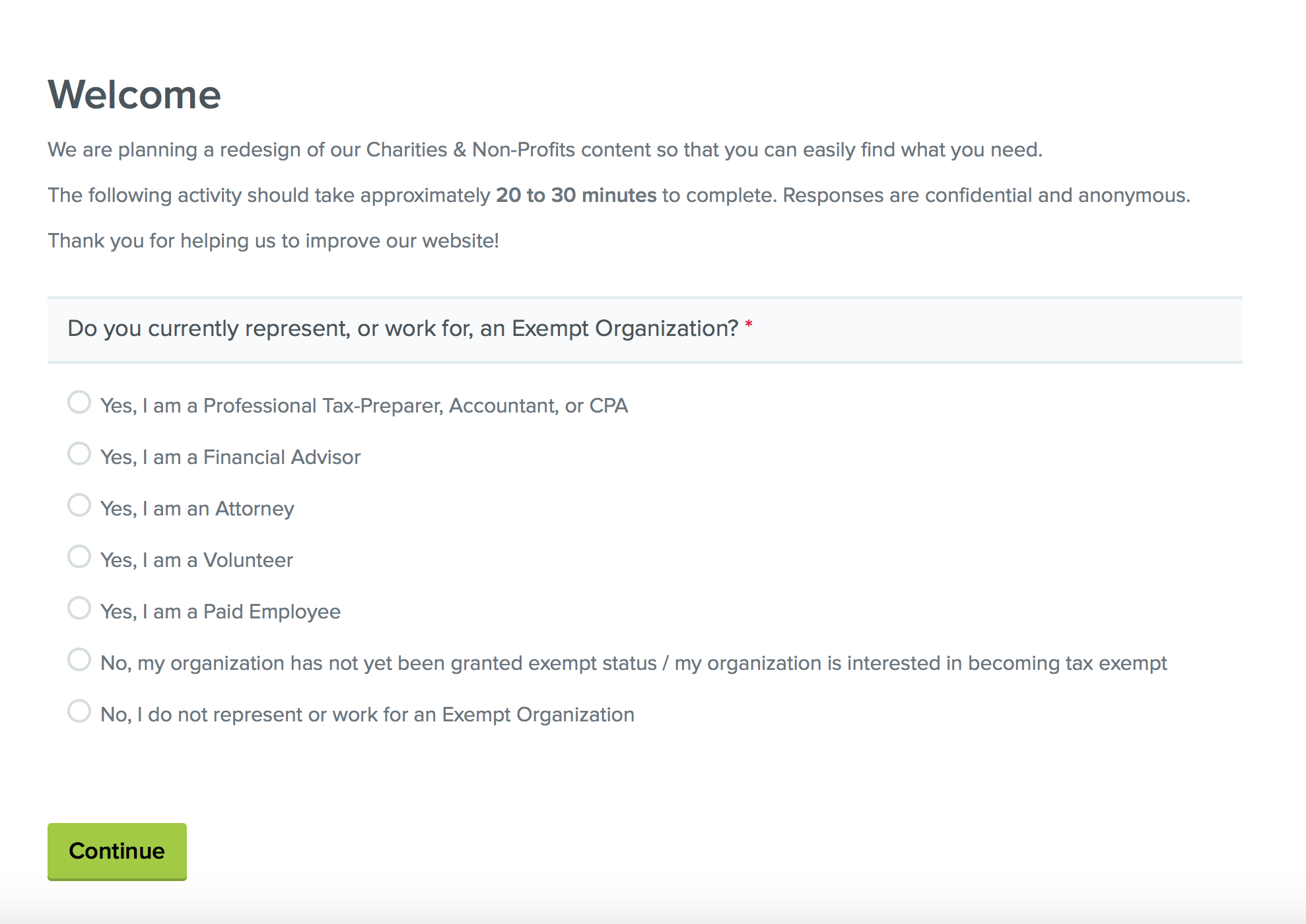 We are planning a redesign of the Charities & Non-Profits section of IRS.gov so that you can easily find what you need. The following design activity will ask you to answer a few survey questions and then organize topics related to charities and non-profits into groups that make sense to you. Taking part in this research is entirely voluntary, and participation is anonymous. You may choose not to take part, or you may withdraw from the study at any time.