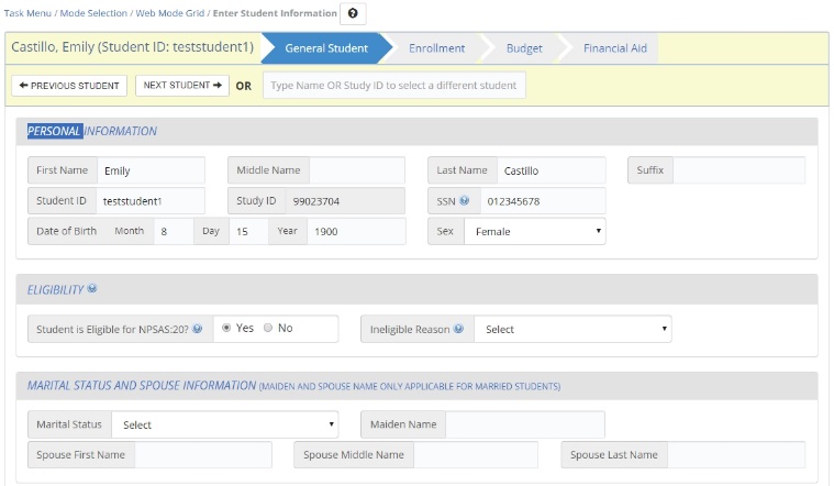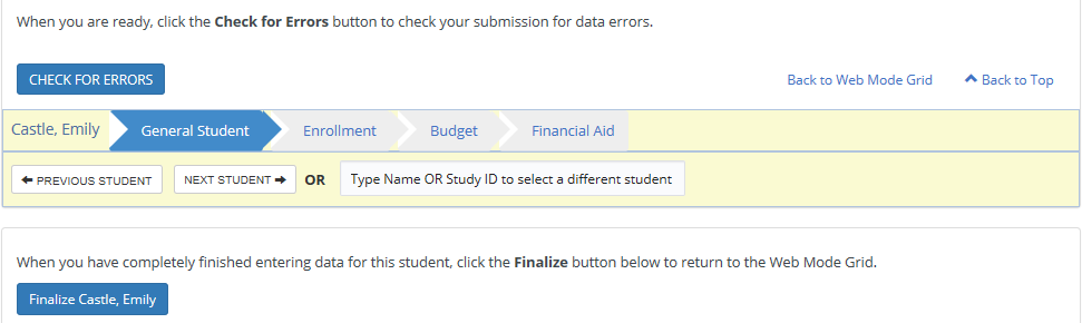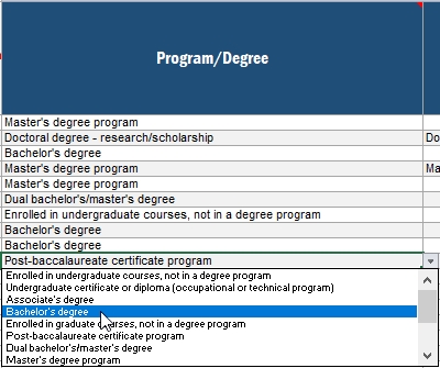 El nombre de los programas de ayuda no se revelará con los datos finales. Esta información se usará para revisar la calidad de los datos, por ejemplo, para verificar que los montos informados estén dentro de los límites reglamentarios y comprobar que el tipo de ayuda económica y la fuente estén correctamente codificados.Si el estudiante no recibe ayuda de la institución, deje estos campos vacíos. |