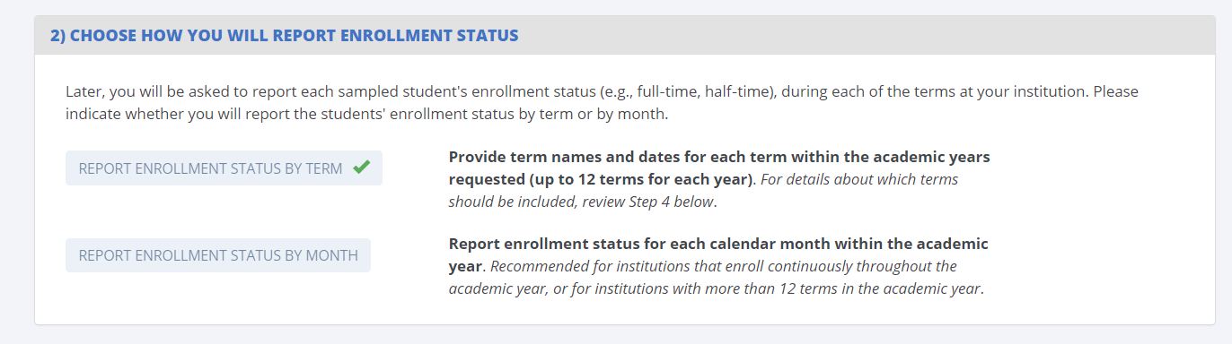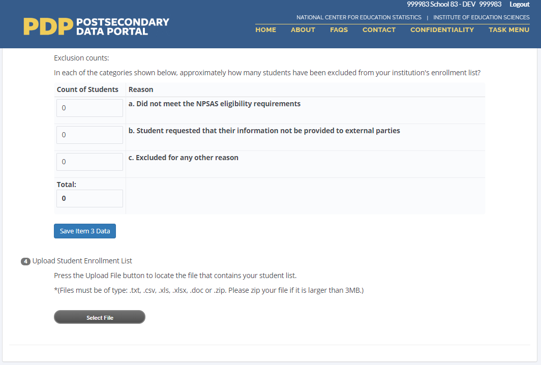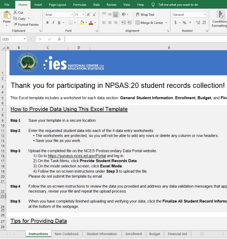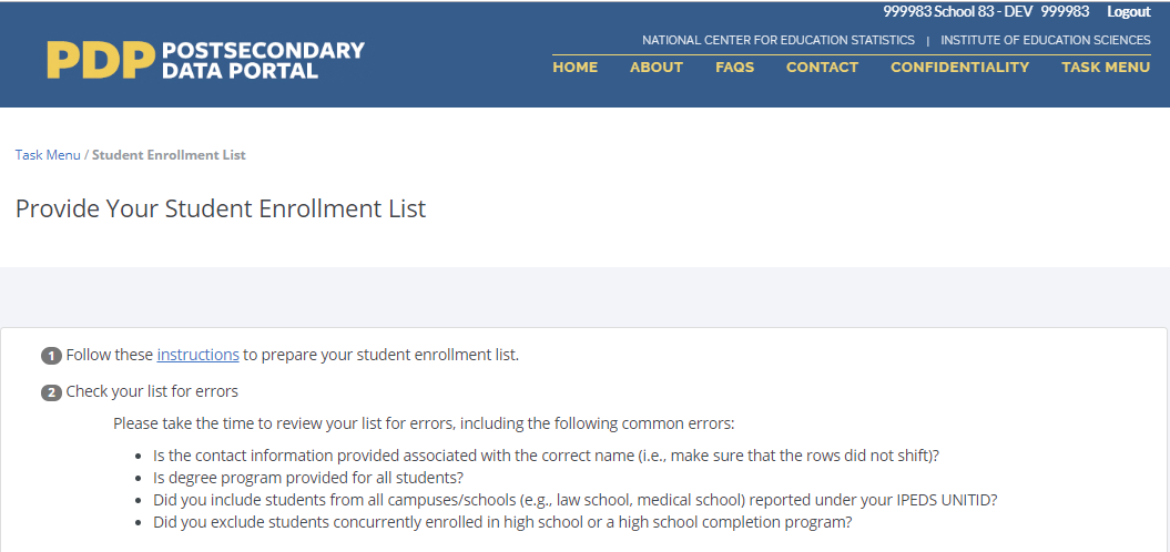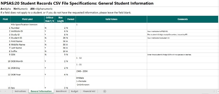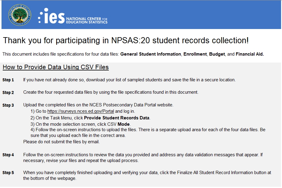 The instructions and website text included in this appendix are based on those submitted for NPSAS:18-AC and assume that each institution will create their own student enrollment list files using the instructions and file specifications included in this appendix. NCES is currently exploring options to provide institutions with templates, programs for statistical software, or additional tools that will reduce the burden associated with gathering and formatting the data for the student enrollment list. If one of these approaches proves feasible, the materials below will be updated to give institutions the option of creating their own enrollment list file using the specifications or downloading the template or program provided to them on NCES’ Postsecondary Data Portal (PDP) website.