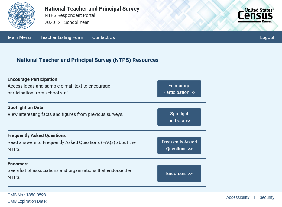 NTPS Online Screener and Respondent Portal Website Including Teacher Listing Form (TLF)
