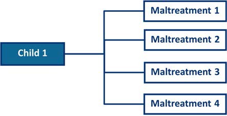 Step 3: A child in a report can have up to four maltreatments. All maltreatments for a child must be of a different type. All of these maltreatments reside in a single record with the child. Each maltreatment type has its own maltreatment level, which is the disposition or finding associated with that specific maltreatment type.