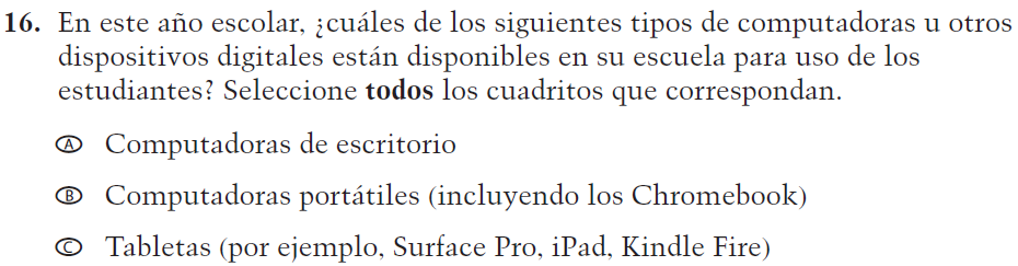 De acuerdo al Paperwork Reduction Act de 1995, no se les requiere a las personas que respondan a una recopilación de información a menos que tal recopilación exhiba un número válido de control OMB. El número válido de control OMB para esta recopilación voluntaria de información es 1850-0928. Se estima que el tiempo necesario para completar esta recopilación de información es de un promedio de 30 minutos, incluyendo el tiempo para leer las instrucciones, buscar los recursos de datos existentes, recopilar los datos necesarios y completar y revisar la recopilación de información. Si tiene cualquier comentario acerca de la exactitud del tiempo estimado, sugerencias para mejorar esta recopilación o cualquier comentario o preocupación acerca del estatus de la presentación individual de su formulario, por favor escriba a: National Assessment of Educational Progress (NAEP), National Center for Education Statistics, Potomac Center Plaza, 550 12th St., SW, 4th floor, Washington, D.C. 20202.