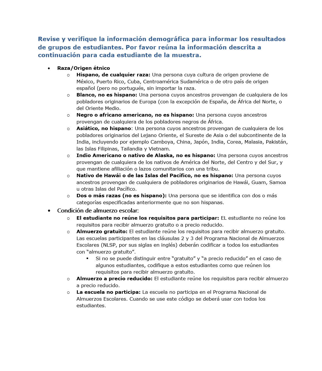 Información necesaria para revisar y verificar los estudiantes seleccionados para NAEP