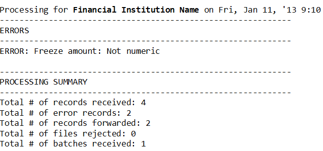 You will receive the following response codes when X9 FIs send amended responses to the previous response code ‘05’ Valid values are: 07 – Manual review – Will be used if FI sends an increase in freeze amount. See FI Message Text field for further information. 22 – FI Initiated Response (FIR) – FI released the freeze or restraint on the account and reduced the freeze amount to zero dollars. See Message Text field for further information. 24 – FIR – FI reduced the original amount of the freeze or restraint to an amount greater than zero dollars. See Message Text field for further information. |