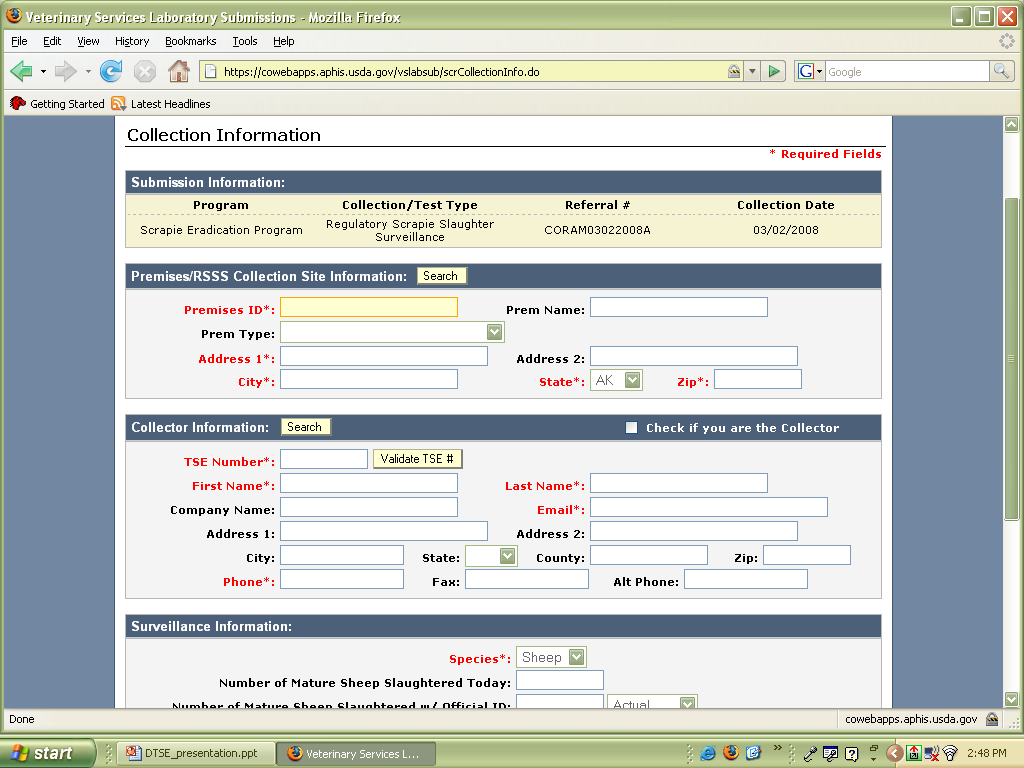 Regulatory Scrapie Slaughter Surveillance (RSSS)--Information obtained from VS Form 10-4, RSSS Worksheets (Appendix B), or entered directly as samples are collected.