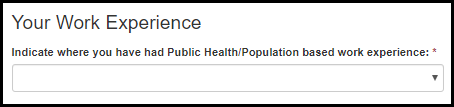 Biological, biomedical, or animal sciences Business, management Community health, public health Decision or quantitative sciences Economics (agricultural, applied, health) Engineering, industrial engineering, operations research Environmental, occupational sciences Epidemiology Global, international health Health education Informatics (public health, clinical, nursing) Health services administration, health policy analysis Health services research, quantitative policy analysis Information technology, information science, computer science Liberal arts, general studies, humanities, language, literature Maternal and child health Mathematical sciences, statistics, biostatistics Physical or chemical sciences Political science, law Public administration, policy analysis Social/behavior science (anthropology, social work, psychology) Other