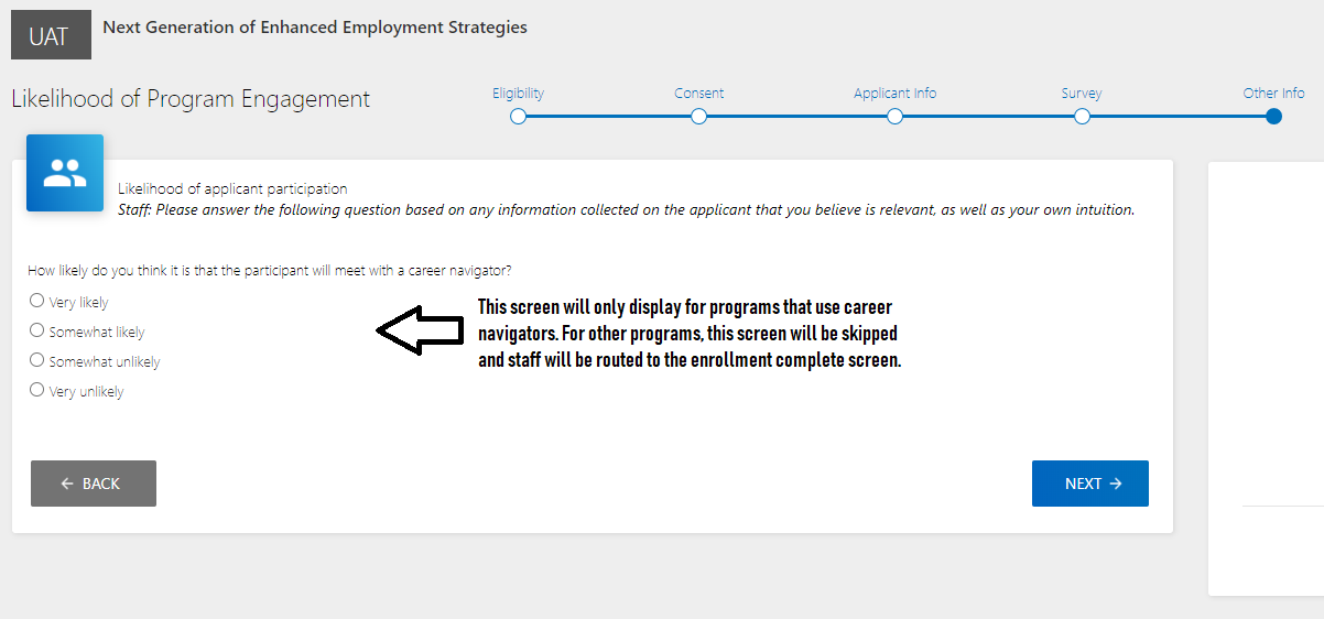 The purpose of this information collection is to evaluate innovative programs serving individuals facing challenges to employment and economic independence to expand the evidence base. Public reporting burden for this collection of information is estimated to average 25 minutes per response, including the time for reviewing instructions, gathering and maintaining the data needed, and reviewing the collection of information. This is a voluntary collection of information. An agency may not conduct or sponsor, and a person is not required to respond to, a collection of information subject to the requirements of the Paperwork Reduction Act of 1995, unless it displays a currently valid OMB control number. The OMB # is 0970-0545 and the expiration date is 04/30/2023. If you have any comments on this collection of information, please contact Mathematica at NextGenProject@mathematica-mpr.com.