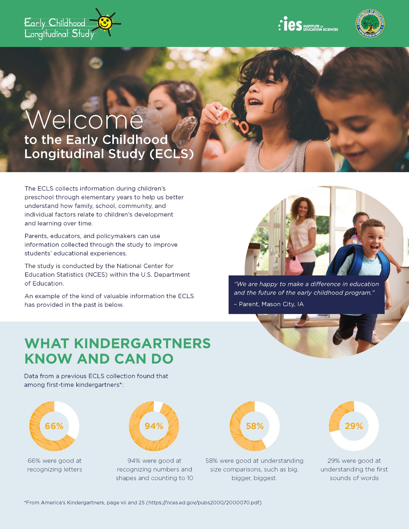 Did you know? In the late 1990s, 66% of first-time kindergartners were skilled at recognizing letters of the alphabet. This is just a little bit of what we learned from previous ECLS data collections, an important set of studies conducted by the U.S. Department of Education. Is this still true for kindergartners today? We will investigate such issues in the new ECLS and need participation from selected households like yours to update national data on today’s children. You can find more information online at https://nces.ed.gov/ecls/.