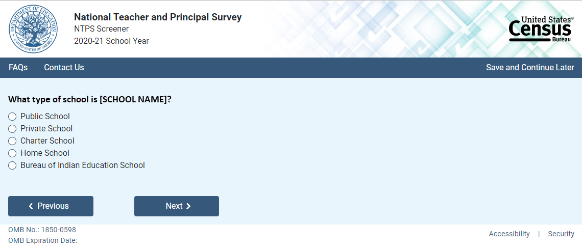 The NTPS Screener is a web-based survey, the purpose of which is to collect basic information about the school, confirm the eligibility of the school in the NTPS, and establish a point of contact at the school (a “survey coordinator”) for subsequent NTPS data collection operations.