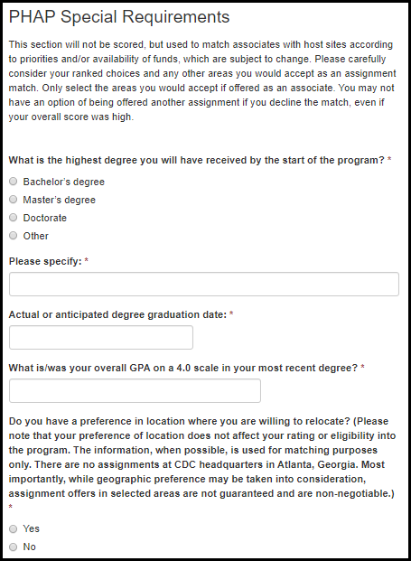 Biological, biomedical, or animal sciences Business, management Community health, public health Decision or quantitative sciences Economics (agricultural, applied, health) Engineering, industrial engineering, operations research Environmental, occupational sciences Epidemiology Global, international health Health education Informatics (public health, clinical, nursing) Health services administration, health policy analysis Health services research, quantitative policy analysis Information technology, information science, computer science Liberal arts, general studies, humanities, language, literature Maternal and child health Mathematical sciences, statistics, biostatistics Physical or chemical sciences Political science, law Public administration, policy analysis Social/behavior science (anthropology, social work, psychology) Other
