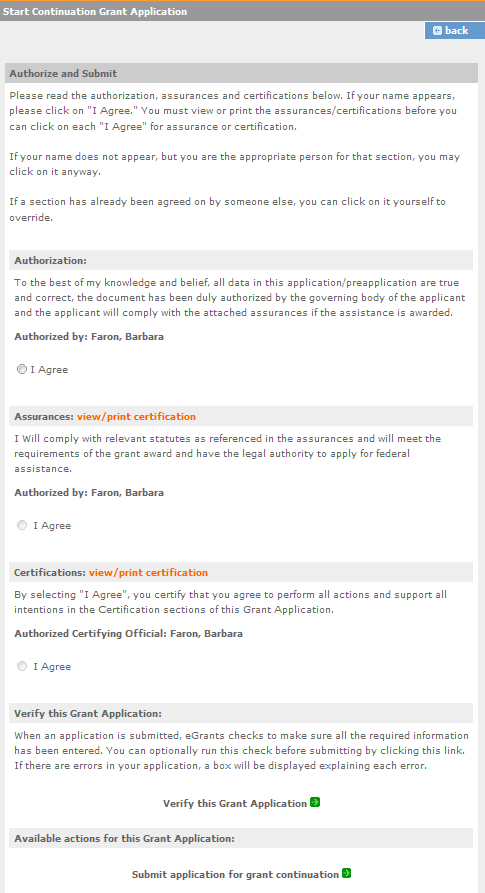 On the next screen, the authorizing representative will be able to select the “I Agree” radio button for the authorization, assurances, and certifications for this grant application. To submit your continuation application, click on the ‘Submit application for grant continuation.’