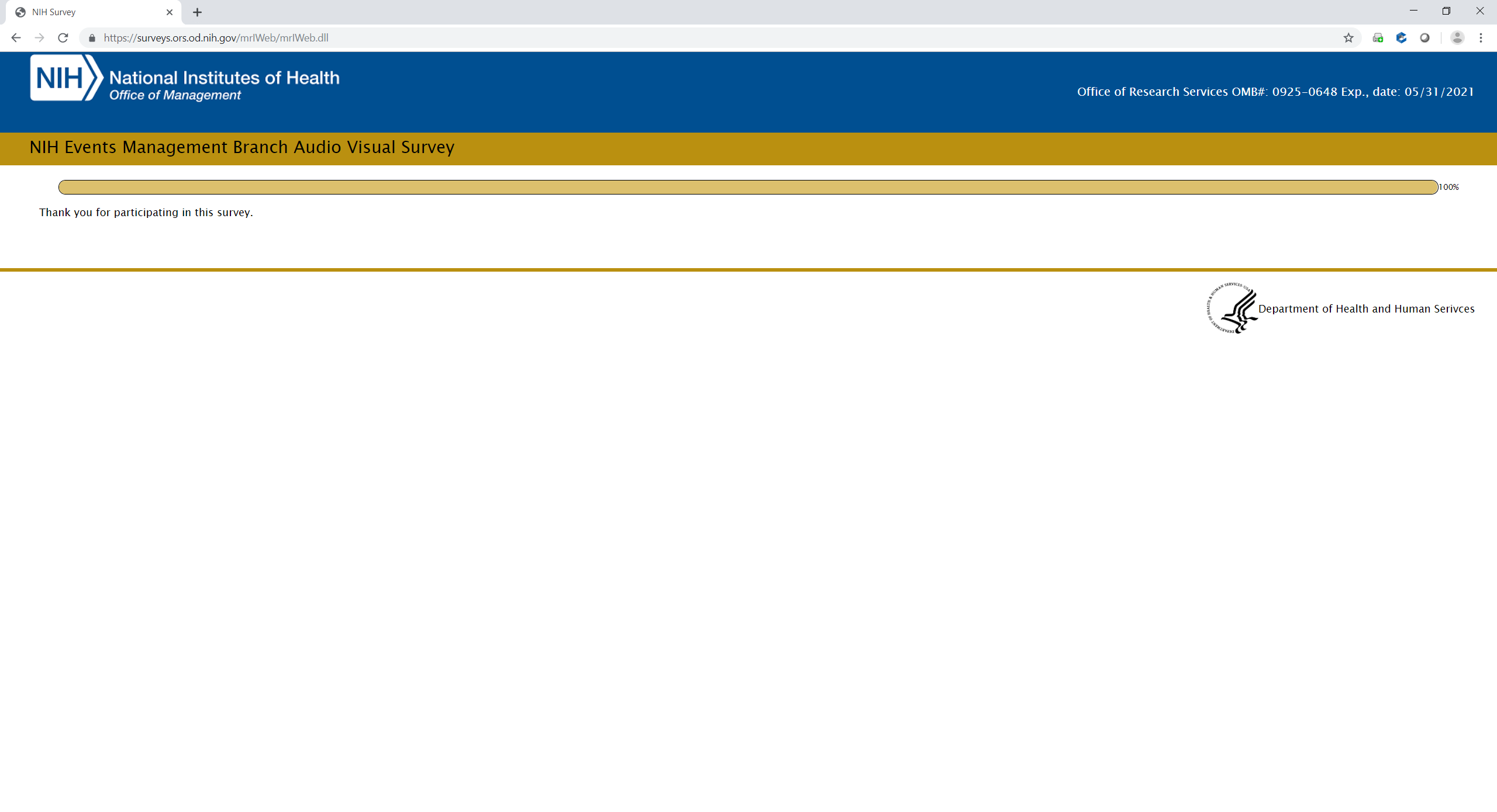 This survey asks a series of questions about your perception of the NIH Events Management Branch’s Audio Visual Services. Your feedback is valuable and will be used to evaluate current service use and satisfaction. We are also gathering ideas for improvement to better meet your needs. The data you provide will be combined with the responses of others and analyzed for an overall program performance.