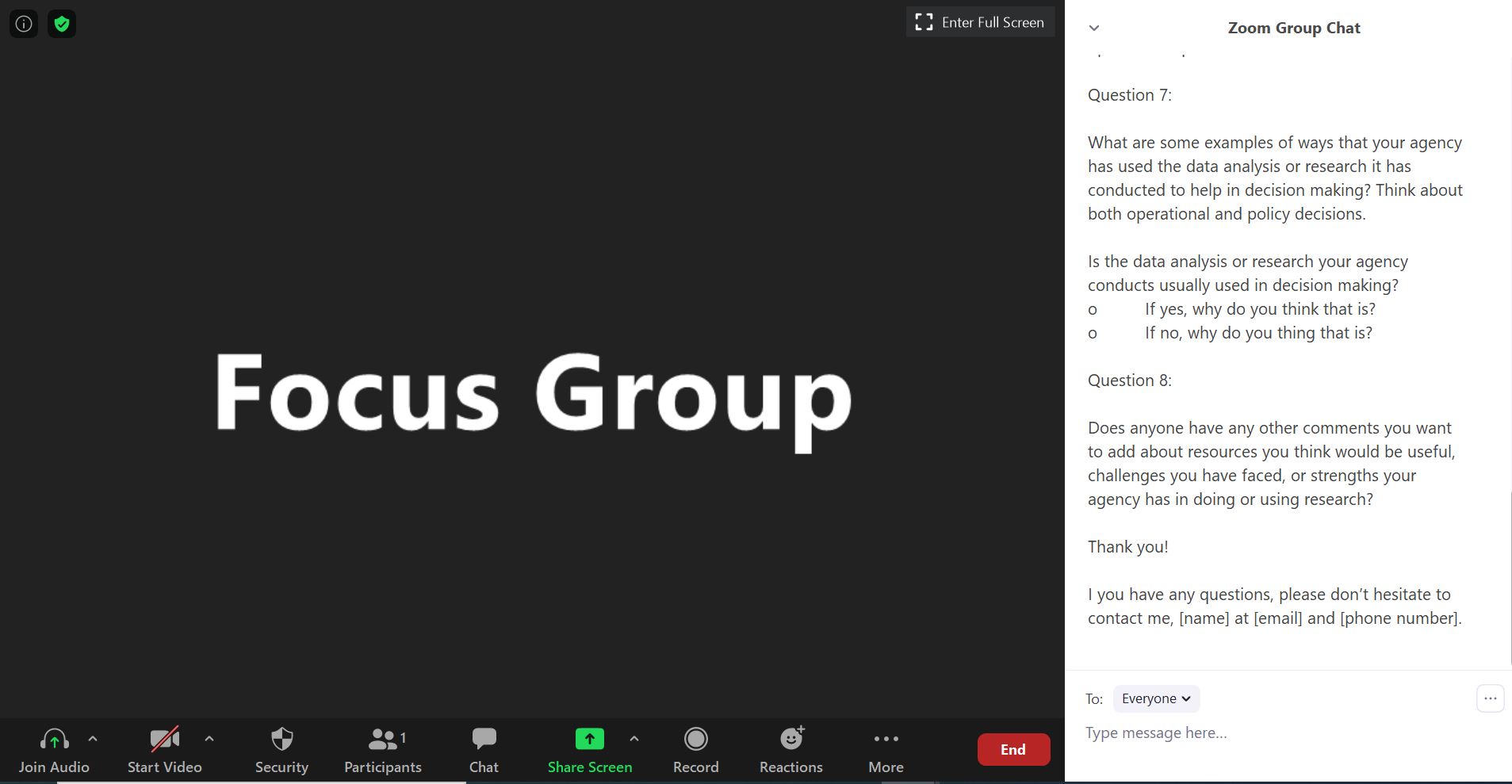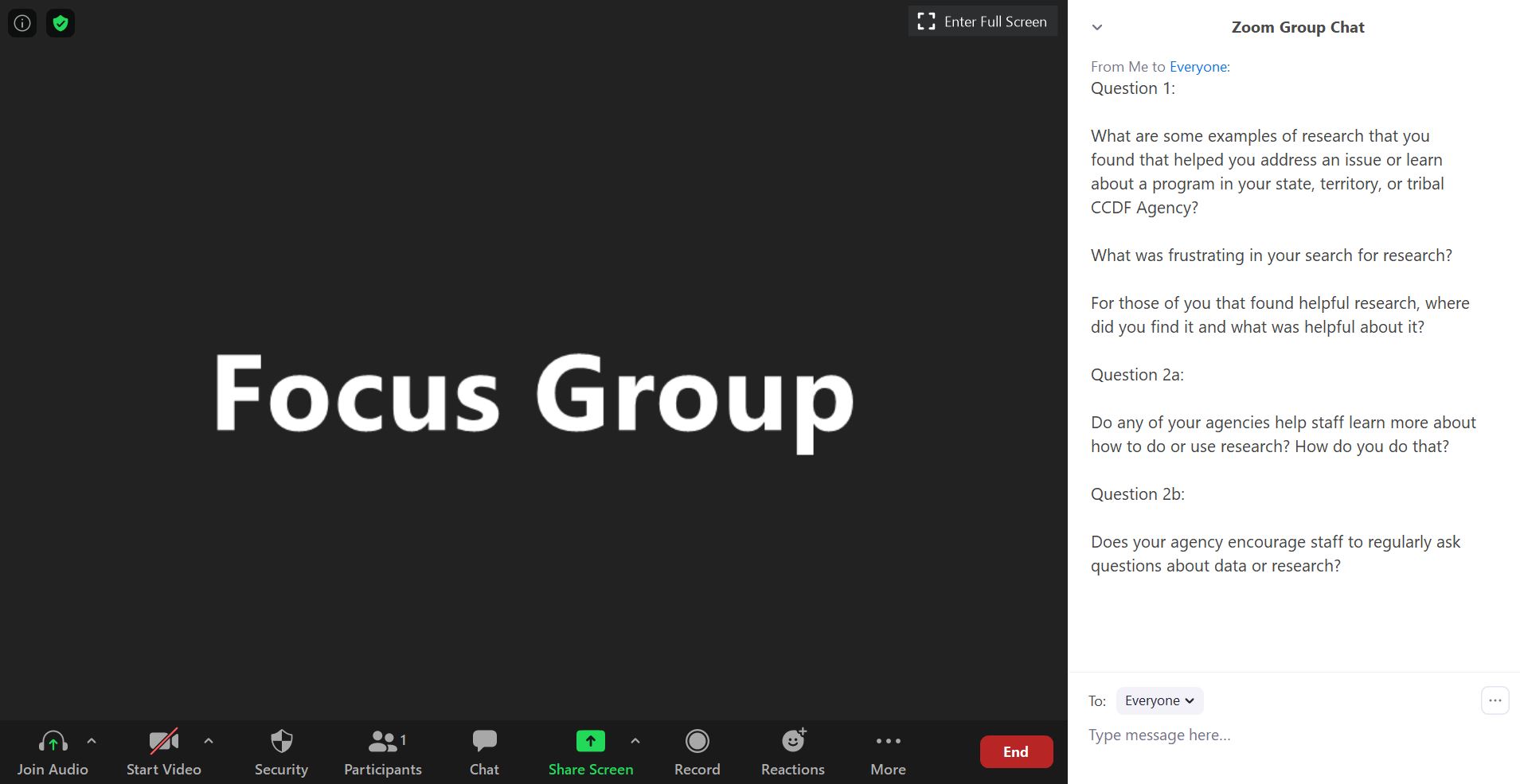 The images displayed until the end of this document are screenshots of what participants will generally see on their screen during the virtual focus group. It shows the setup of Zoom and how each question will be shown to the participants through the Zoom Group Chat (on the right side of each image). A difference is that where it says “Focus Group” with the black background on each image, participants will instead see video of other participants, or the facilitator, depending if they have chosen to have their video on. We want to create a setting like they are in a room together. Also, we will add the questions into the Chat one at a time, but given how Chat works, sometimes more than one question will appear to the viewer. And, because participants could also add text into Chat, exactly what is on the screen at any moment may look a little bit different from what it looks like in this document.