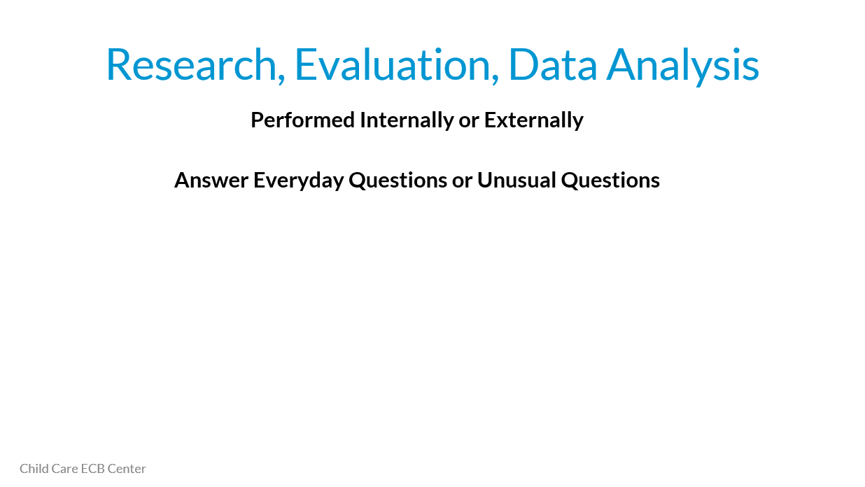 Not everyone gets training to use or do research when they are in school. Many folks who work in CCDF Agencies came up through program services or went to school to learn how to serve children or families, and not specifically how to examine data or research.