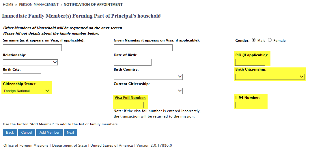 DS-2003 Form / Notification of Appointment (Diplomatic) Request: eGov pages