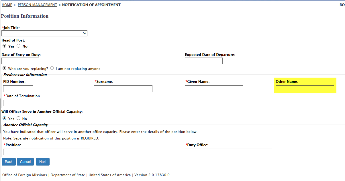 DS-2005 Form / Notification of Appointment (Honorary Consular Officer) Request: eGov pages