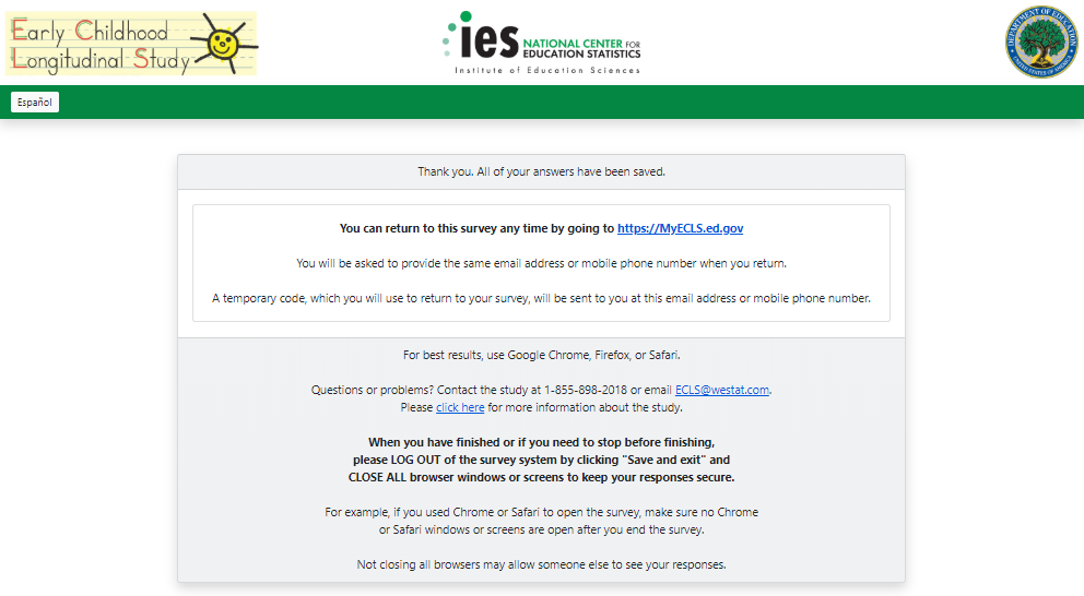 Usted puede volver a esta encuesta en cualquier momento yendo a https://MyECLS.ed.gov