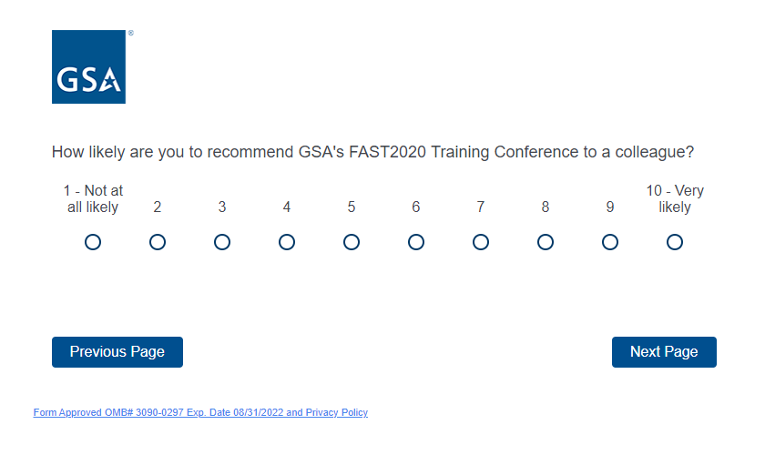 Below is the text that corresponds to the hyperlink above titled “Form Approved OMB# 3090-0297 Exp. Date 08/31/2022 and Privacy Policy”. The hyperlink appears on each page of the survey.