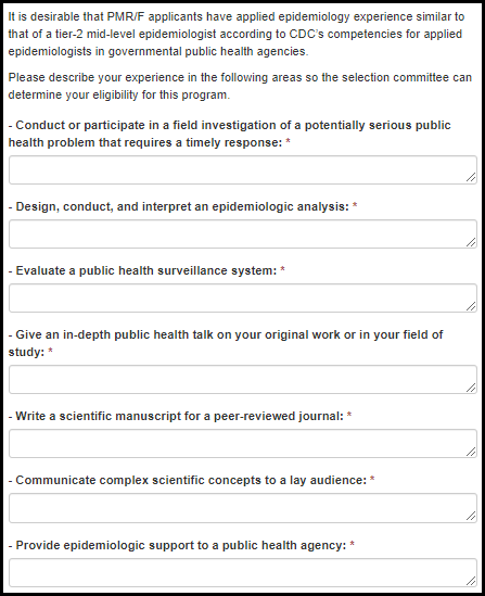 The purpose of this document is to list all the data elements collected online through the Fellowship Management System (FMS). The FMS online application module is a streamlined mechanism for applicants of the Centers for Disease Control and Prevention (CDC) fellowships to submit their information online and track statuses of the application processes (e.g., all required materials received, invited for interviews). The FMS is a robust flexible framework and the FMS Application Module is tailored successfully for various CDC fellowships: