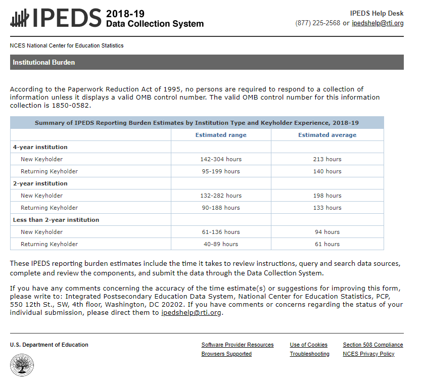 IPEDS is a web-based data collection system designed to collect basic data from all postsecondary institutions in the United States and the other jurisdictions. IPEDS enables NCES to report on key dimensions of postsecondary education such as enrollments, degrees and other awards earned, tuition and fees, average net price, student financial aid, graduation rates, student outcomes, revenues and expenditures, faculty salaries, and staff employed. The IPEDS web-based data collection system was implemented in 2000-01. In 2017-18, IPEDS collected data from 6,642 postsecondary institutions in the United States and the other jurisdictions that are eligible to participate in Title IV Federal financial aid programs. All Title IV institutions are required to respond to IPEDS (Section 490 of the Higher Education Amendments of 1992 [P.L. 102-325]). IPEDS allows other (non-title IV) institutions to participate on a voluntary basis; approximately 200 non-title IV institutions elect to respond each year. Institution closures and mergers have led to a decrease in the number of institutions in the IPEDS universe over the past few years. Due to these fluctuations, combined with the addition of new institutions, NCES uses rounded estimates for the number of institutions in the respondent burden calculations for the upcoming years (estimated 6,400 Title IV institutions plus 200 non-title IV institutions for a total of 6,600 institutions estimated to submit IPEDS data during the 2019-20 through 2021-22 IPEDS data collections). IPEDS data are available to the public through the College Navigator and IPEDS Data Center websites.