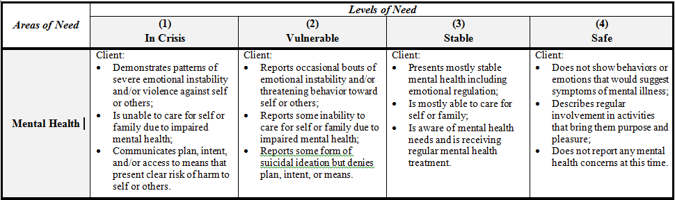 23. MENTAL HEALTH: Assesses the general emotional well-being of the client. Use the SOT-PWI-S or convert your program tool’s assessment measure to the SOT-PWI-S levels of need for this domain.
