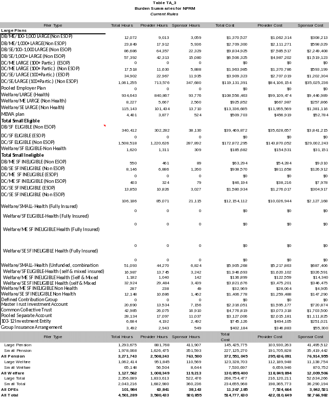 To estimate the economic impacts of the proposed rule, we first aggregate the baseline burden hours per schedule by multiplying plan counts by burden hours for each schedule. The aggregated total burden hours are estimated by size, type and by entity (service provider v. plan sponsor). Then total costs per entity are estimated by multiplying total burden hours of each entity by respective wage rates. Next, we aggregate the total burden hours per schedule under the proposed rules by multiplying projected plan counts by projected burden hours for each schedule. Then these burden hours are converted to total costs by multiplying the aggregate total hours per schedule and per entity by respective wage rates of each entity. The difference between the total costs under the proposed rules and under the current rules are the economic impacts of the revisions.