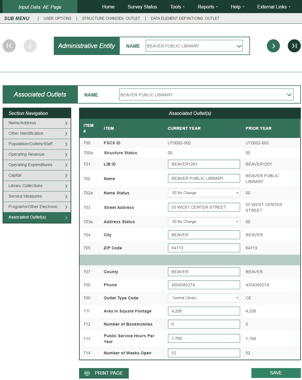 The administrative entity (AE) is the legally established agency that provides library services to the population of a local jurisdiction. An AE must operate one or more direct public library service outlets. The AE’s offices may be located in one of the outlets (e.g., a single-outlet central library or a branch of a decentralized multi-outlet operation) or in separate quarters (e.g., an office adjacent to an independent bookmobile’s garage). The data reported for each AE are the combined data for all of its outlets. (See Appendix A to review the AE data elements included on the PLS.)