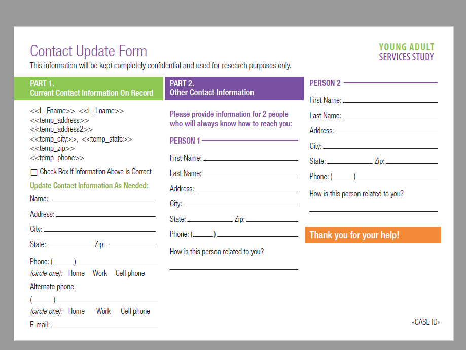 In the last year, you participated in a survey for the Young Adult Services Study (YASS). To prepare for our next round of surveys, it is important we know how best to reach you.
