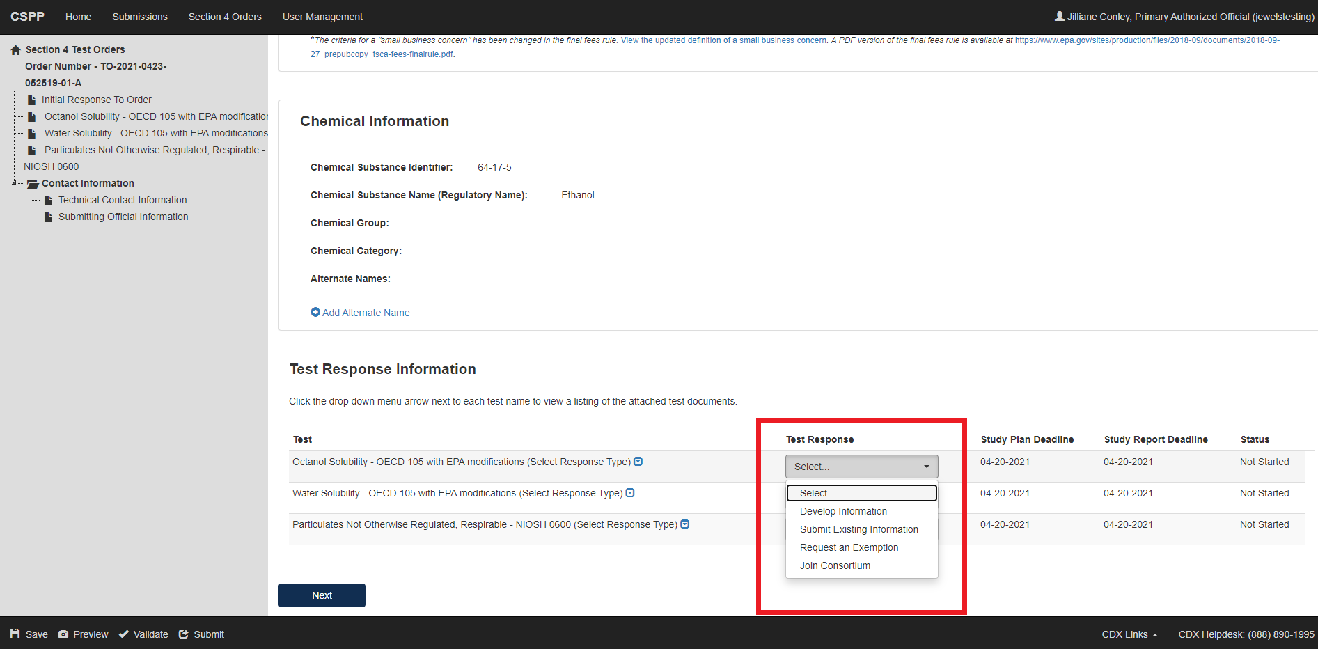 This document presents the user guide for the Office of Pollution Prevention and Toxics (OPPT) Section 4 Test Order Submissions. The TSCA section 4 application is the electronic, web-based tool provided by Environmental Protection Agency (EPA) for the submission of data. As a Primary Authorized Official, you can create, modify, and submit. You can also delete data, create amendments, and download the Copy of Record (CoR).