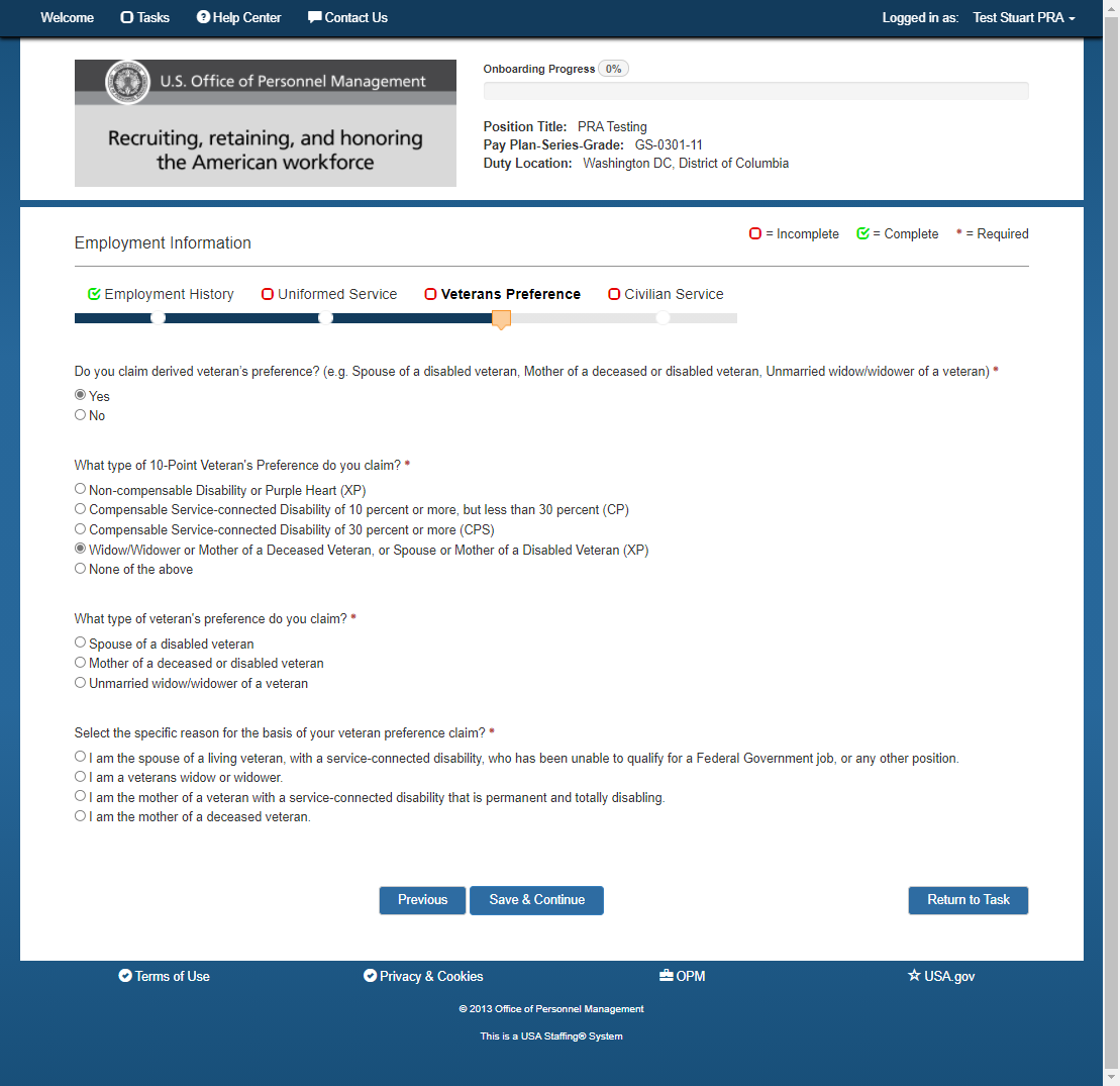 The removal of paper processes has improved the quality, speed, and security of onboarding new employees and substantially increased the quality of engagement between Human Resources (HR) and the incoming employee. Agency HR representatives identify the required forms and documentation that must be provided in accordance with each agency’s business and legal requirements. USA Staffing facilitates the process in a single online, secure, and configurable tool that is accessible by all participants in the onboarding process. The information collected through USA Staffing is only accessible by personnel the agency deems necessary to the onboarding process.